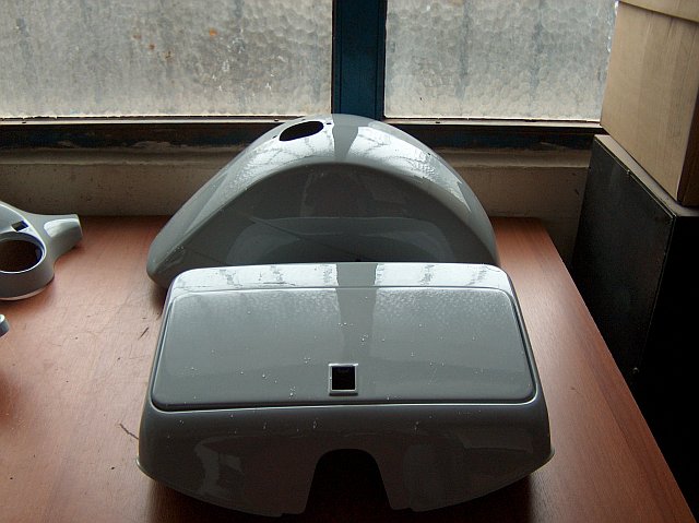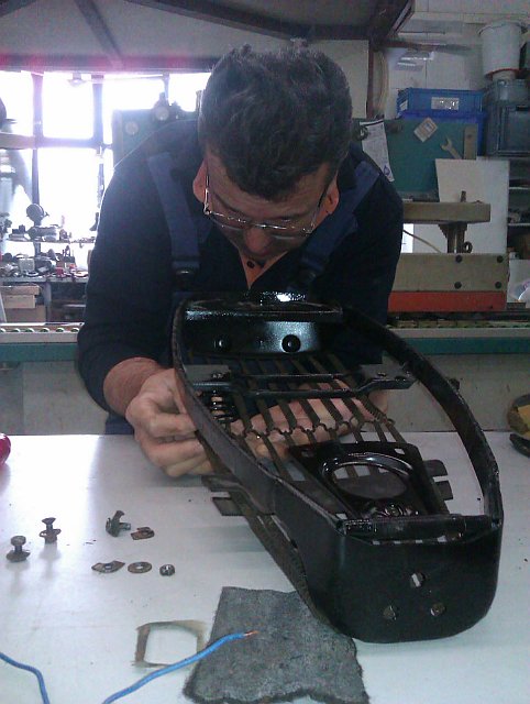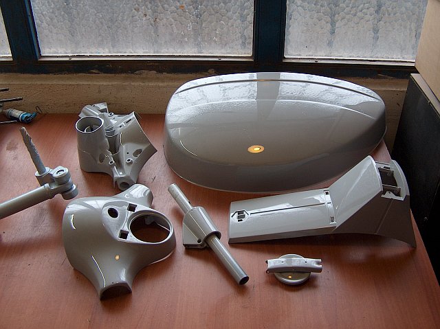 Hemen işe koyulmak gerek. Boya yapılan parçaları kontrol etmekle başladım. Gayet güzel. Hemen kullanılmayacak parçaları özenli bir şekilde raflara yerleştirdikten sonra korna kapağını, marka logolarını taktım.
