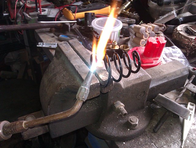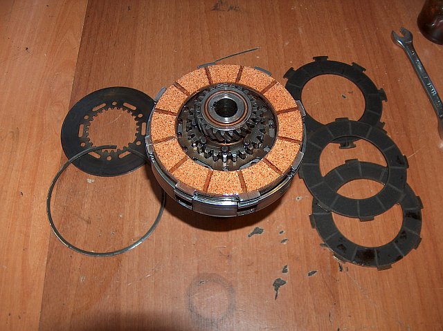 Sonrasında yeni debriyaj balatalarının monte edilmesi geldi. Bu işlem biraz uzun sürdü, üzerindeki 3’lü balata yapısı alttan 6 adet yaylı sistemle desteklenmekte. Bu yaylar çok kuvvetli olunca monte etmek için plan yapmam gerekti. Bunu bir düzenek üzerine oturtulmuş el mengenesi yardımıyla tamamladım. Unutmadan, balatalar montajdan önce 2 zamanlı motor yağında yaklaşık 3 saat beklediler ve bir miktar yağı bünyelerine emdiler. Bu işlem özellikle ilk çalışma esnasında yeni balataların sürtünme sebebiyle yanmaması için önemlidir.