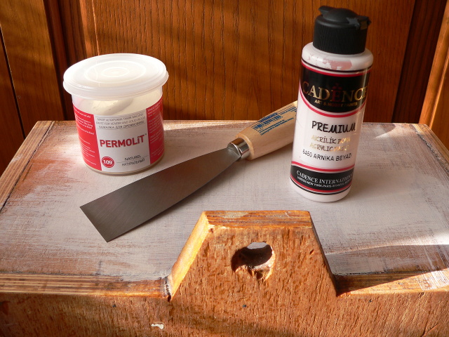 Geçtiğimiz hafta yüzeyler temizlendiğinde sorunlar ortaya çıktı. Boya öncesi tamir edilmesi gereken yerler için ahşap macunu temin ettim, tatbik edebilmek için de küçük ölçekli bir spatula.