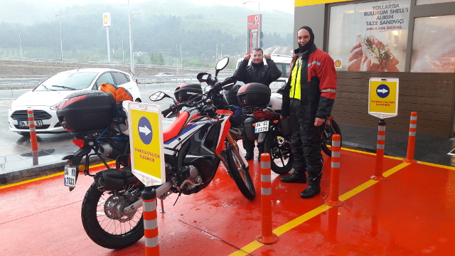 Topçular vapurundan çıkınca yeni otoyola girdik, ardından ilk mola yerinde yağmurlukları üzerimize geçirdik. İçinde motosiklet için ayrı yer tasarlanmış ilk benzin istasyonu.