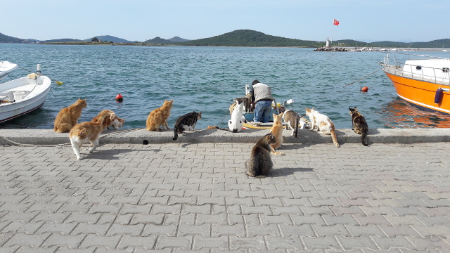 Komisyoncu kediler yanaşan balıkçı sandallarını bekliyorlar.