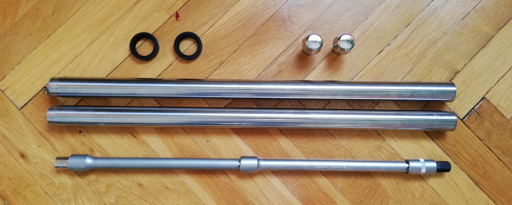 Bir de bu amortisörleri bileşenlerine ayırmak için gerekli bir alet var; uzun kollu 14 numara lokma (üstteki resimde alt parça). İşte bunu temin etmek çok zamanımı aldı. 4 parçadan oluşan takımı almakla da işim bitmedi, bir de küçük torna müdahalesi ile kullanılır hale gelecek. Her markanın bazı kendine özel tamir takımları vardır, işte bunlardan biri.