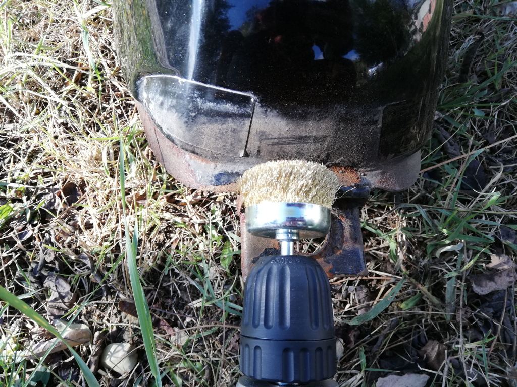 Yerinden söküp çimenlere koydum ve her yerini dikkatle gözden geçirdim. Sonra matkapın ucuna aldığım dairesel tel fırça ile dikkatlicene birkaç deneme yapıyorum. Tabii depoda benzin olduğu için fazla ileri gidemiyorum.