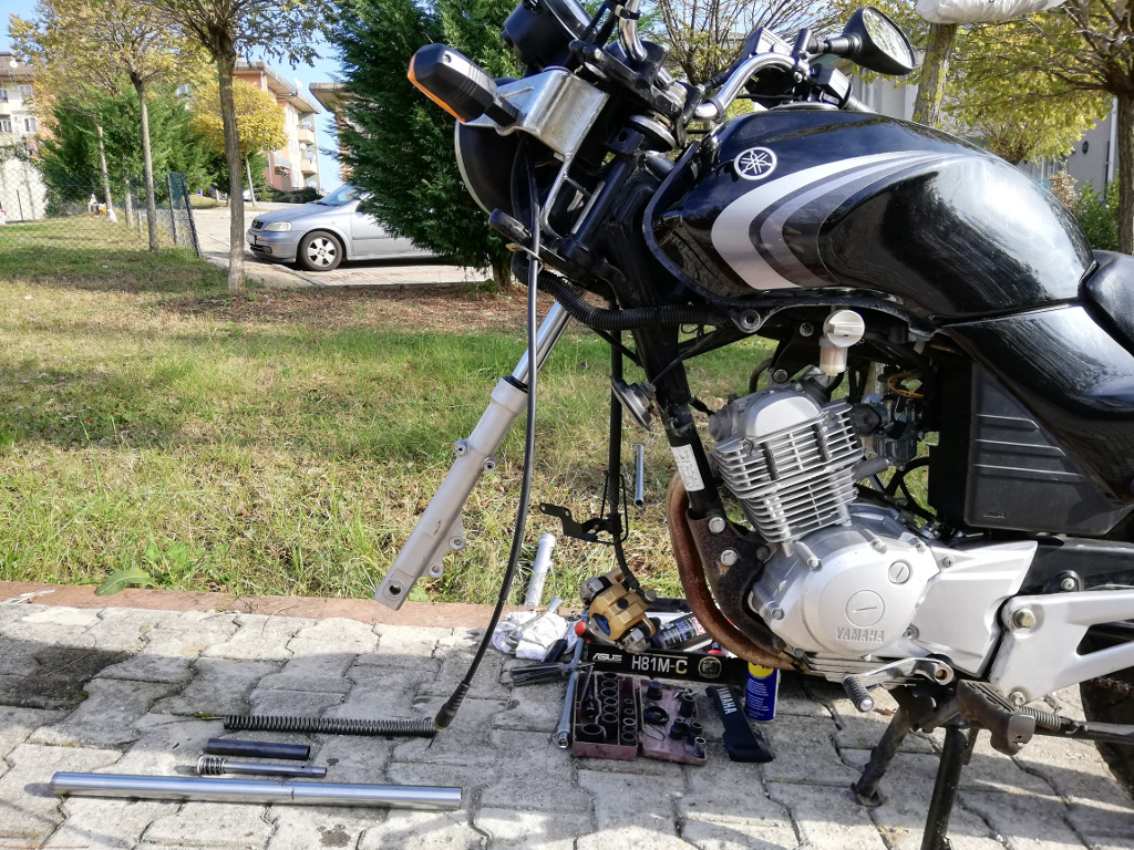 Bugün önemi bir problemi çözdüm, ön amortisörlerin maşaları ve yağ keçelerini değiştirebildim. İlaveten motorun bujisi ve hava filtresi de yenilendi. Maşalar pastan dolayı değişti ancak diğer sarf malzemeleri fabikanın koyduğu orjinallerdi. Hava filtresi üzerindeki kedi tüyleri ise hayli ilginç bir ayrıntı, YBR yıllarca bahçede yatarken kediler de üzerinde yaşamışlar elbette.