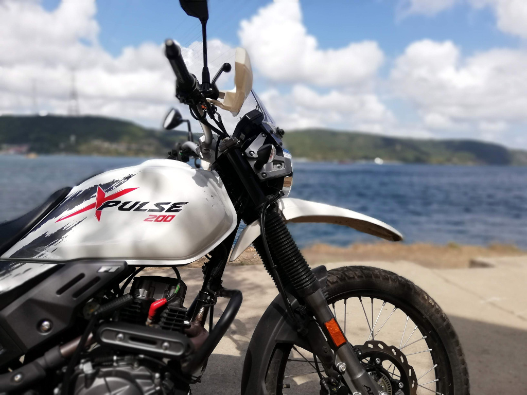 XPulse 200 üzerinde gereksiz girintili çıkıntılı yüzeyler çizgiler yok. Akıcı, yalın hatlara sahip. Yuvarlak farlı, arkada port bagajı da üzerinde.