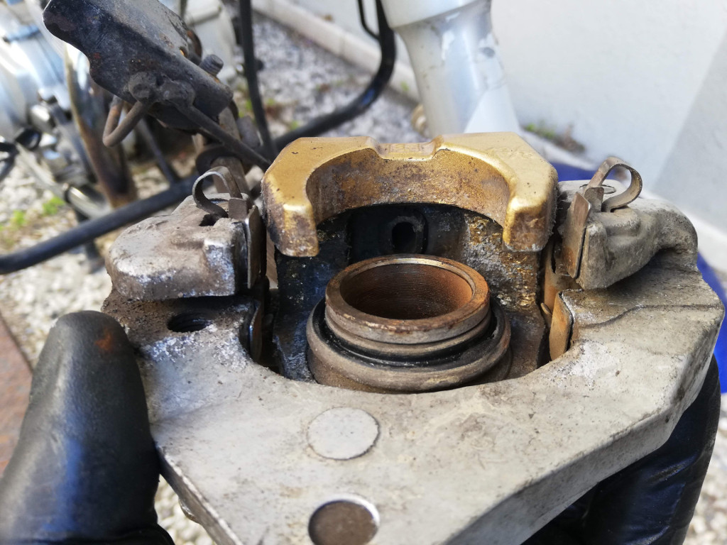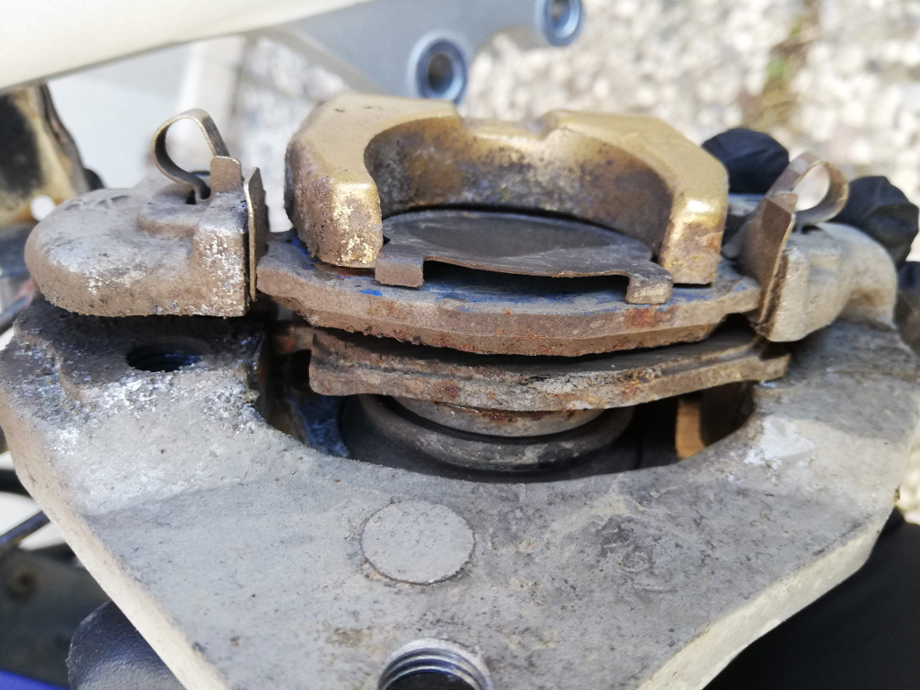 Bugün havanın ısısının 25 dereceye kadar yükselmiş olması çok garip, günlerdir hayli soğuktu. Fırsatı değerlendirip hızlıca ön amortisörleri indirip açtım. Bu esnada fren balatalarının bitik olduğunu fark ettim. Ayrıca fren kaliperi de hayli kirliydi.