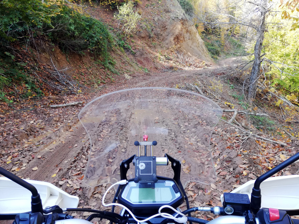 Kimi ıslak, tamamı toprak, inişli, çıkışlı, taşlı dar bir yol. Bolca fotoğraf molaları ile birlikte yaklaşık olarak 3 saatimizi aldı ve bu esnada otomobil traktör görmedik ancak, ormancıların düzenli ağaç kesimi yaptıklarına dair izler ortadaydı. Muhtemelen sabahın erken satlerinde bir araç geçmişti, yani aşırı ıssız bir yer değil sanki.