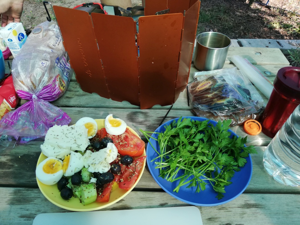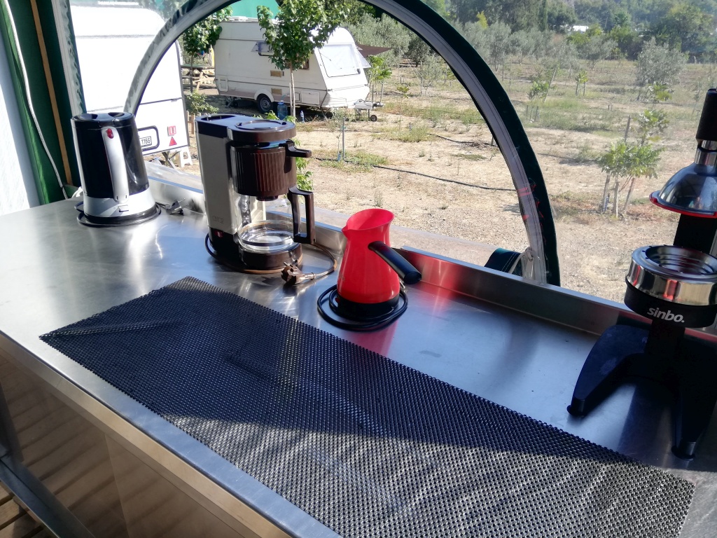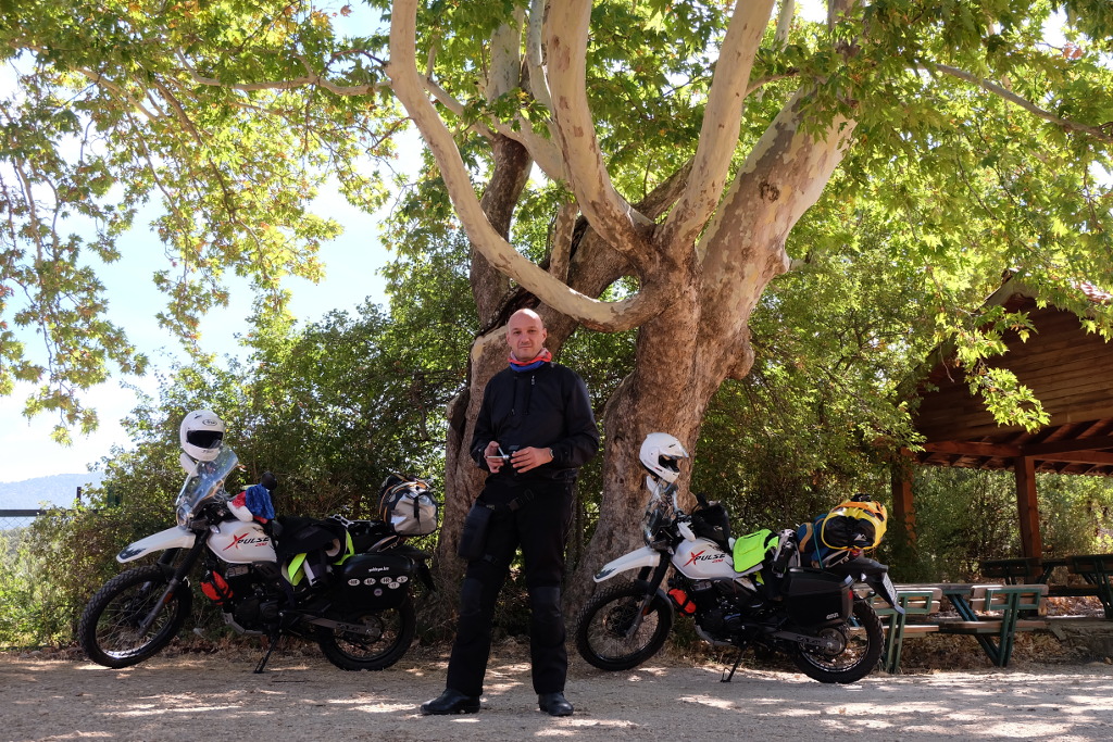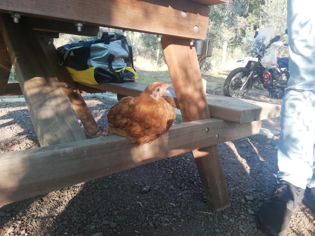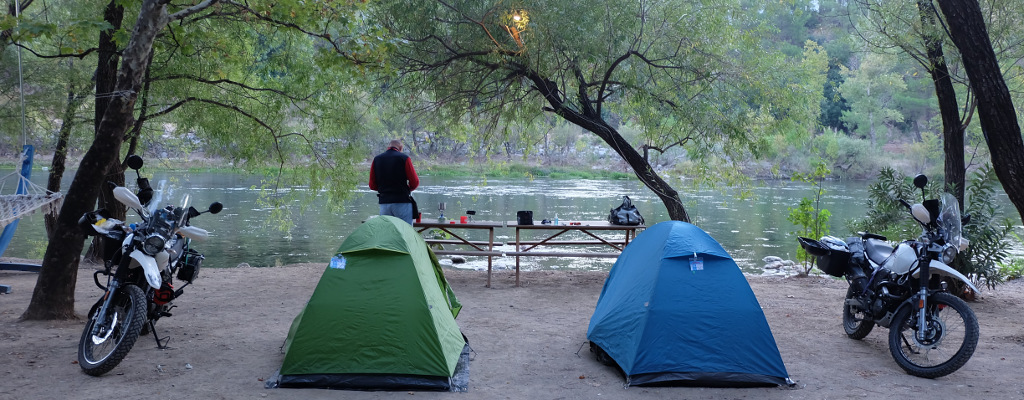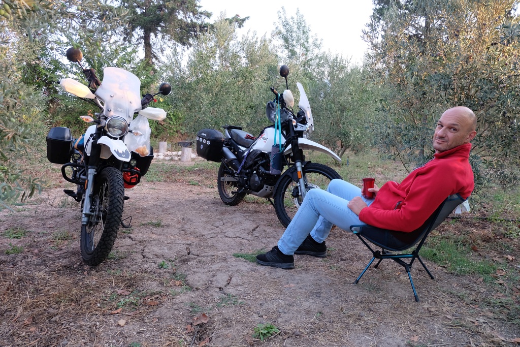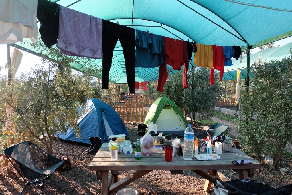 Kadir bey mevsim itibarı ile kampın sakin olmasından dolayı, çadırlarımız için bize zeytin ağaçlarının dibinde, tavukların arasında, motosikletlerimizin yanında ve kocaman masası olan harika bir köşeyi önerdi. Kamp alanı içinde hemen her konaklama noktasına çok yakın konumlanmış elektrik prizleri bulunmasına rağmen, Orhan’ın ve benim çokca elektrikli cihaza sahip olduğumuzu fark edip, masamıza çoklu prizi olan uzatma kordonu getirmesini unutmayacağız.