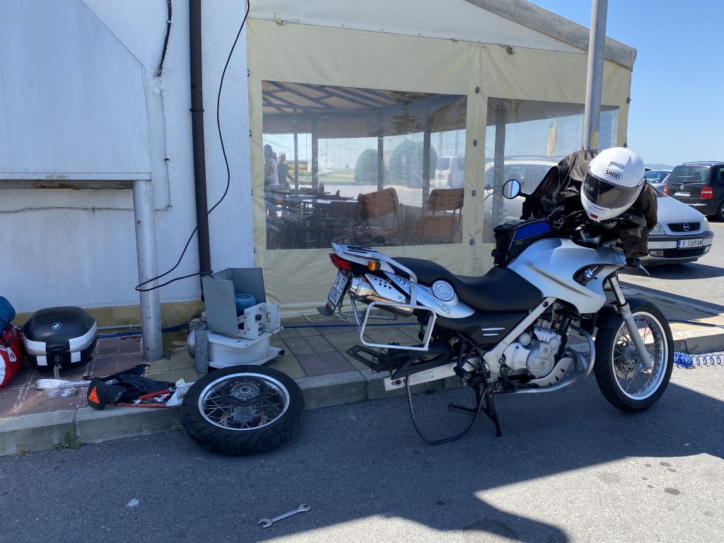 Bir süre sonra bisikletli bir amca geliyor, Bulgarca bir şeyler söyleyerek. Meğer lastikçiymiş. Hemen koyuluyoruz işe. Makina ile sökemiyoruz FormulaX uygulanmış iç lastiği. Ama inadımız inat, yaklaşık iki saat uğraştıktan sonra galip geliyoruz. Yeni iç lastiği takmak, tedbiren yanımda olması için eskisini yamamak derken, işlem sona eriyor. Yolun karşısına geçip, lastiği monte ediyorum. Zincir gergileri ve diğer işler derken, toplam üç saat kayıp ile operasyon sona eriyor. Derin bir nefes alıyorum.